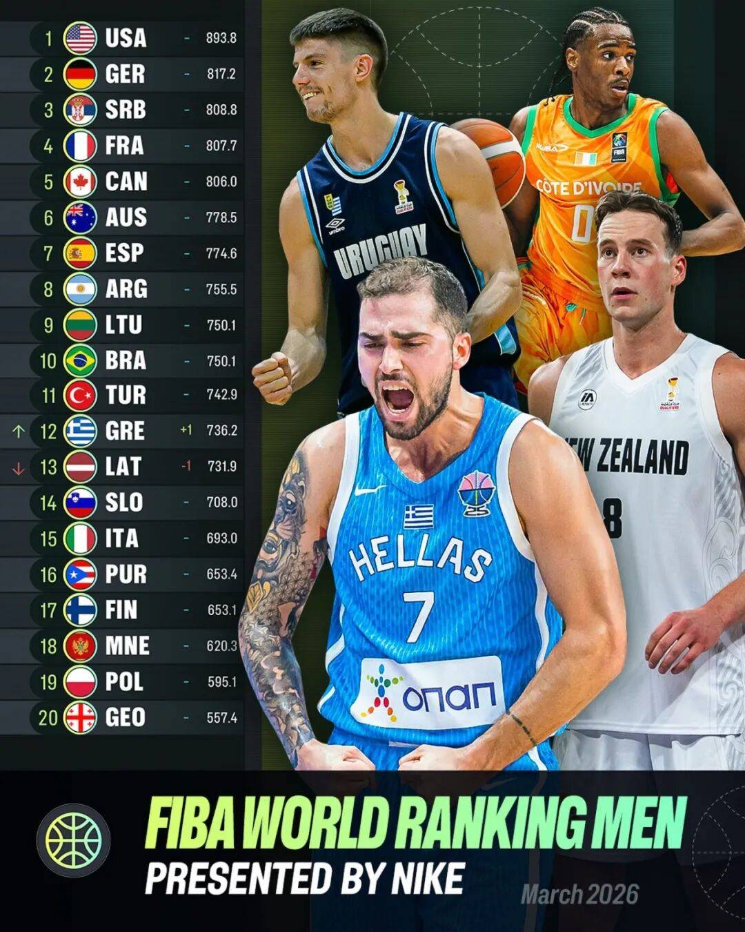 中国男篮世界排名上升1位!排名依旧20开外!中国女篮世界实力榜世界第五!